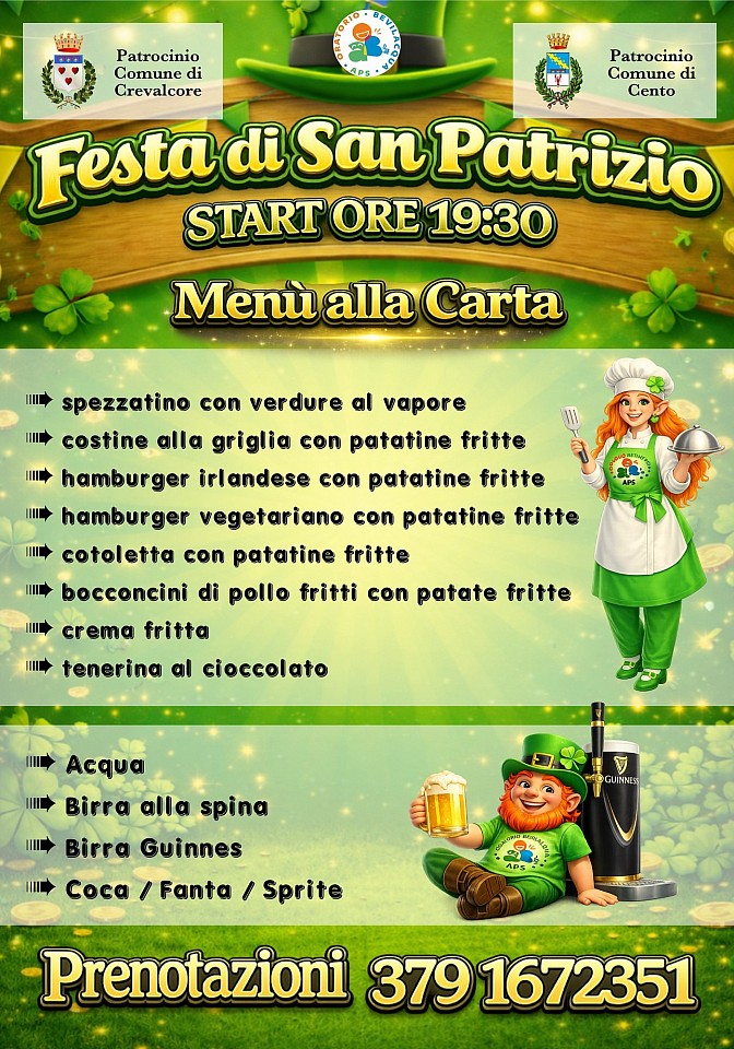 In occasione della Festa di San Patrizio 2026 a Bevilacqua, l’Oratorio Bevilacqua propone un menù alla carta pensato per accompagnare le serate di musica dal vivo in un’atmosfera conviviale e accogliente.